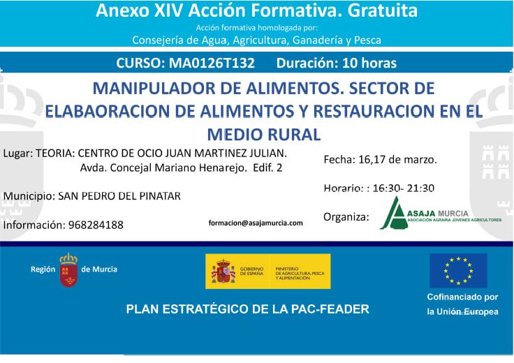 CURSO DE MANIPULADOR DE ALIMENTOS.SECTOR DE ELABORACIÓN DE ALIMENTOS Y RESTAURACIÓN EN EL MEDIO RURAL. SAN PEDRO DEL PINATAR.
