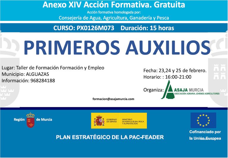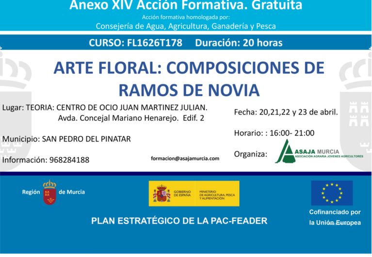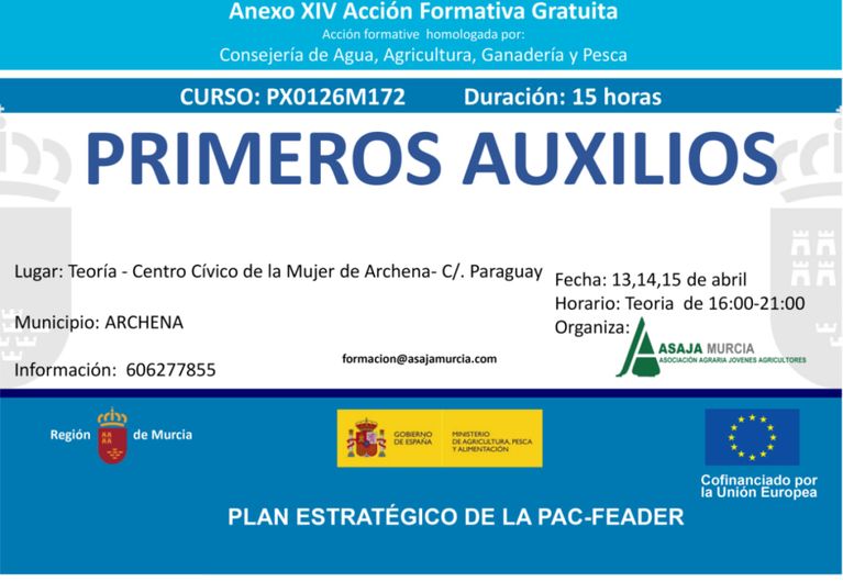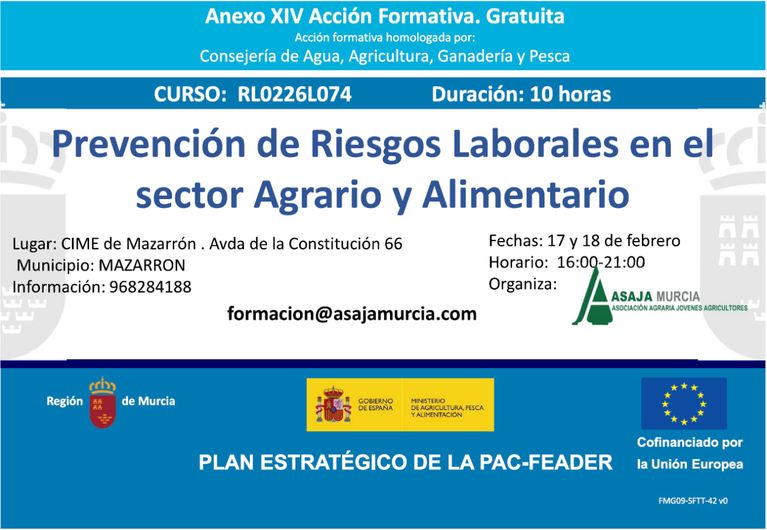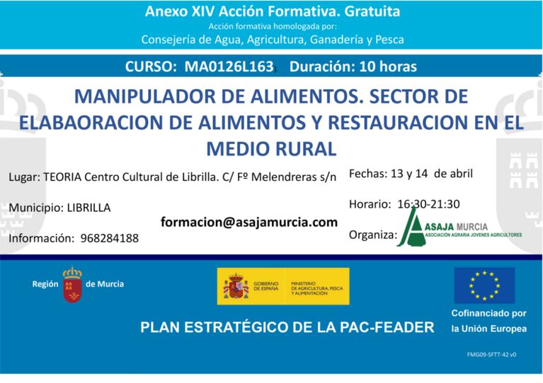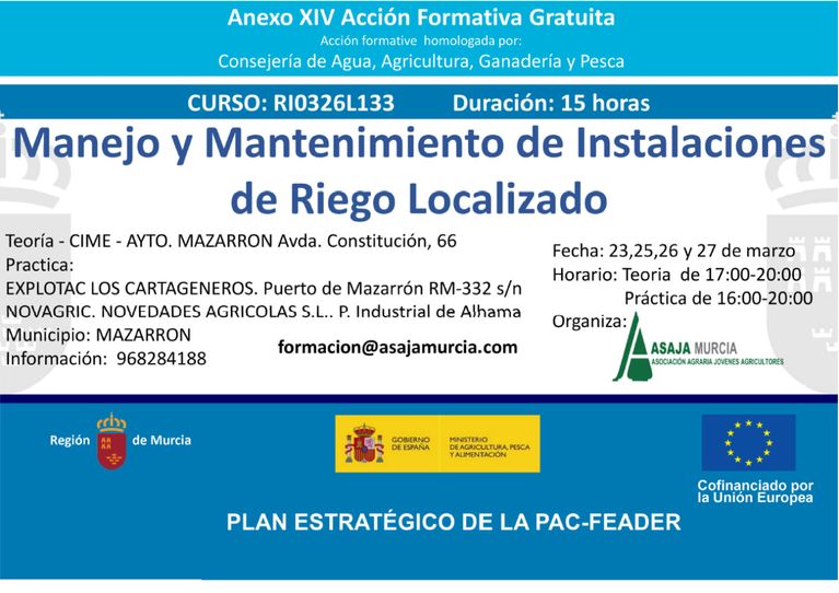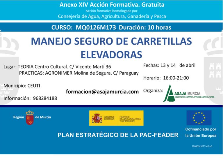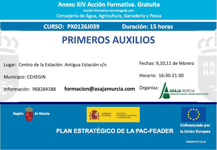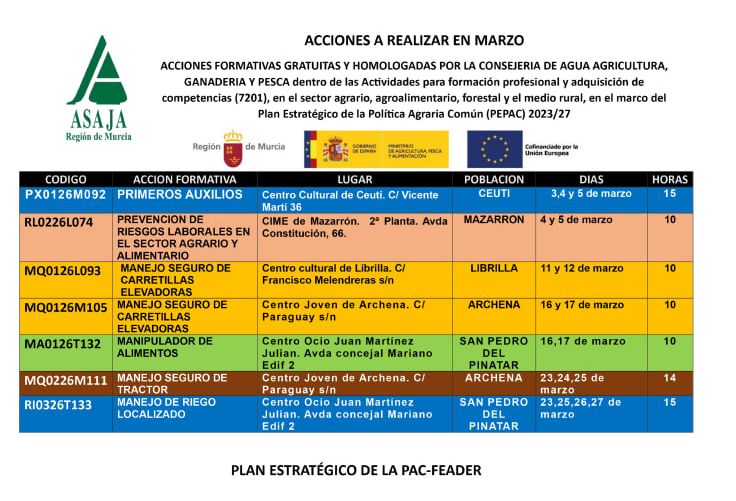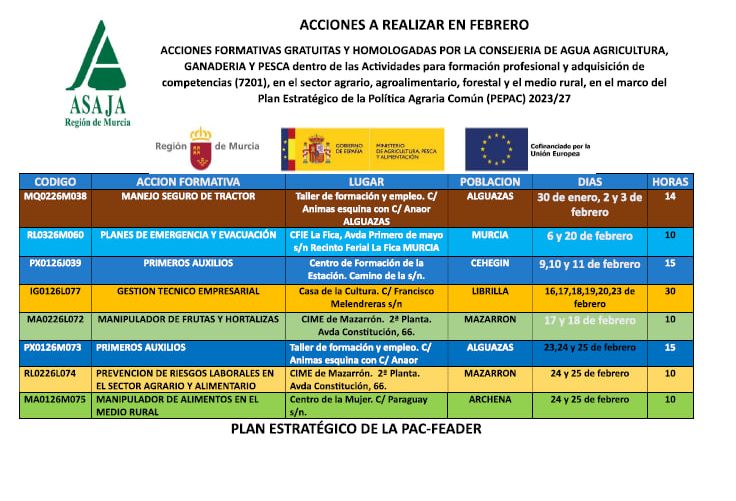 Formación agroalimentaria y para el desarrollo rural, dirigida a agricultores, ganaderos, trabajadores y desempleados del medio rural en colaboración con la Comunidad Autónoma de Murcia, el Ministerio de Agricultura y el Fondo Europeo de Desarrollo Rural.
