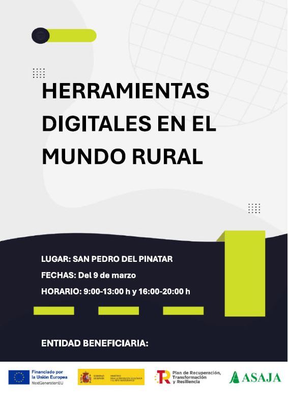 ASAJA organiza este curso sobre Digitalización en redes sociales, en el municipio de Alguazas ( Murcia ) dentro del programa de formación e información en el medio rural del Ministerio de Agricultura, Pesca y Alimentación. Duración 25 horas, del 15 al 19 de abril de 2024.